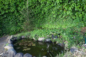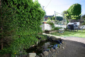 Pond in the backyard with water flowing towards the house ( to bring wealth)