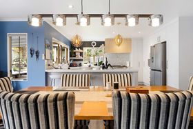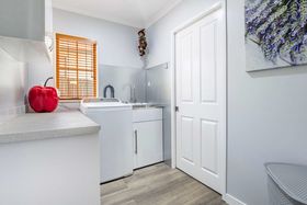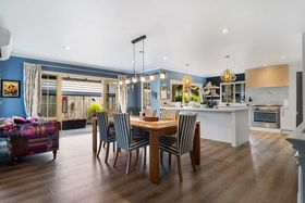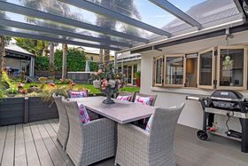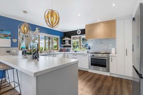 The layout flows easily across five bedrooms, two bathrooms and generous living zones that bring everyone together while still giving each person room to breathe. The lounge has personality and warmth, opening to a spacious dining area that's perfect for hosting. The kitchen is crisp and contemporary, fitted with premium appliances, plenty of bench space and that effortless connection to the outdoors every family loves.