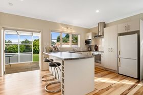 Inside, a polished timber hallway guides you through to the main living zones, where open-plan lounge, dining and kitchen areas connect. Large windows bring in generous natural light, while neutral tones and soft finishes create an inviting, easygoing atmosphere. The kitchen sits comfortably within the space, featuring ample cabinetry, good bench space and a generous island with breakfast-bar seating. Timber flooring adds warmth and sliding doors open the living area out to the garden, enhancing the indoor-outdoor flow.